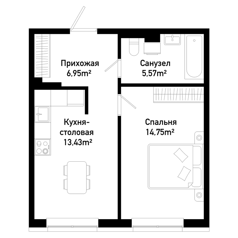 1-комнатная  44.74 м2